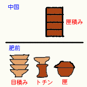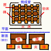 もう一つは窯構造の違い。やはり窯詰め方法が異なるため窯構造にも違いが認められる。たとえば、焼成の際、製品の温度をできるだけ均一にするため、通常、火の通りにくい製品下部はいくらか焼成室床面から浮いた状態にされる。肥前の場合は、トチンやハマなどを用い、匣鉢なども焼台を敷いて底面に空間ができるようにしている例が認められる。ところがこうした簡易的な方法では、匣鉢を詰高く積み上げるような場合は、安定感を保つことができない。そこで、陂溝窯の場合は、焼成室の前後方向に磚をずらっと数列並べて一種のロストル風の施設を作っている。この磚列と磚列の間を跨ぐように匣鉢を載せて焼成するのである。 |
