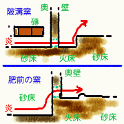 福建省・しょう州市の窯は、これまで調査されたすべての窯が同様な構造をしており、この陂溝窯のような例がごく一般的なスタイルであったと考えて間違いないだろう。 陂溝窯の焼成室をみると、平面プランが方形に近く、前部に燃料を投入する火床、後部に製品を焼成する砂床が配置されている。また、燃料は薪で各室の火床の側面に焚口が設けられている。こう記すと一見肥前の窯と類似しているようにも思えてしまうがいくつかの点で決定的な違いがある。 |