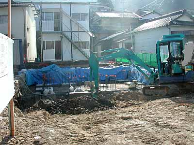● 発見の経緯 有田町幸平に位置する上有田交番が、老朽化に伴い今年度事業で建替えられることになった。伝統的建造物群保存地区内であることから、それに先立ち、当初は、建物の景観上の点から、佐賀県警と有田町で協議が行われていた。この場所は周知の遺跡の範囲内ではないため、埋蔵文化財担当の立場としては静観していたが、12月15日にようやく建物上はGOサインが出され、さっそく建物の基礎掘削に取りかかることになった。そこでまったく予想外に発見されたのが、幸平遺跡である。 ![]() (近景)