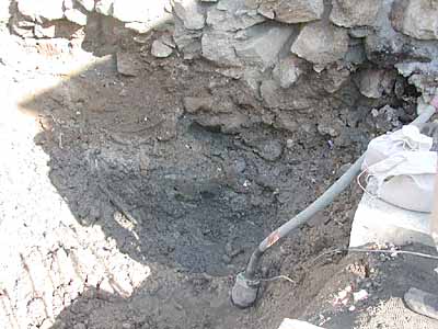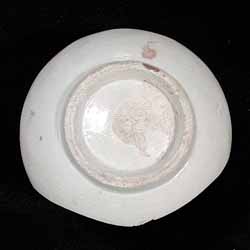 ● 発見されたもの この場所は水脈が浅く、地表から2mほども掘るとどんどん水が沸いてくる。そのため水中ポンプを設置するための穴を掘り、そこから重機で周囲に向って掘りはじめた。磁器片がパラパラと混じっていた。しかし、これは窯業の町である有田の常で、それ自体遺跡であることの証拠とはならない。ところが、その中に1点色絵片らしきものが混じっているのを発見。17世紀後半の初期輸出タイプの製品であった。もしかして…、という気も一瞬よぎったが、ここは赤絵町ではなく幸平である。まさかそんなこともないだろうと思い直した。しかし、よく見ると、重機のバケットから一杯、二杯と上がってくる土の中に、ぱらぱらと色絵片が混じっていることを発見。しかも、出土する磁器片は白磁の割合が異常に高い。これは、以前赤絵屋が発見された赤絵町の郵便局の敷地と類似している。あらためて、これはもしかしたらと思い、出土する土層の上面までで掘削を止めることにした。さらに掘削面が広がると、点々と杭や柱が残っているのが明らかになり、また、絵具を入れた状態の碗や上絵具のテストピース状の施文がされた磁器片なども出土した。 ![]() (掘削面)