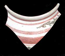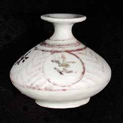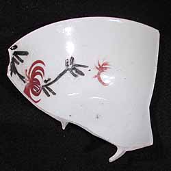 ● 出土品 この遺構上面までの掘削で出土した製品は、約100点ほどである。もちろん全体的には染付が多いが、含まれる白磁の量も、通常の組成から見れば、一見して分かるほど多い。そして色絵がぱらぱらと混じっており、ほかに青磁なども出土している。 今回は、その中で色絵3点を掲示してみた。1点目は碗で、いわゆる嗽碗と称される種類のものである。内面には赤と緑で牡丹の文様が描かれている。2点目は油壷で、赤絵具を主体として胴部の4方向に丸文を配し、その中に花卉文、周囲を地文で埋めている。3点目は壺で、やはり赤主体とした横帯文などが施されている。何れも1660〜70年代前後の製品と推定されるもので、また、意外にもこれ以後染付製品などは散見されるが、色絵製品は皆無である。 ![]() ![]() (内面) (外面)