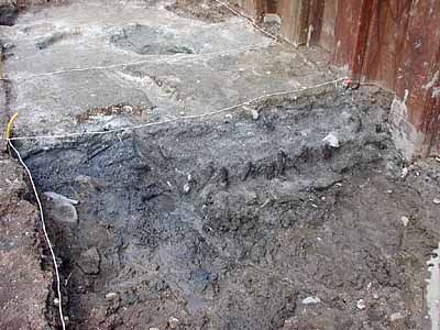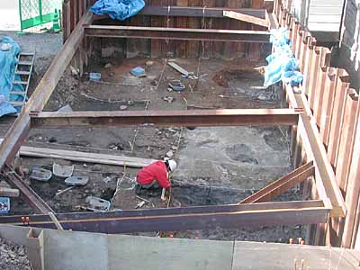 南側(写真手前側)の3区付近では、一部17世紀の土層を掘りはじめた。いくつか杭列が発見されているが、まだ明確な並びは判明していない。17世紀の土層は現在判明しているだけで数層あり、今のところ、出土遺物の傾向は上下2つの層に大別できる。上層は白磁や色絵が集中的に出土する層で、部分的にしか遺存していないが、この層には染付製品などは極めて少ない。しかし下層になると白磁や色絵はごく少なくなり、染付製品などが主体となる。 ![]() 検出した杭列の一部(A−3区) |
