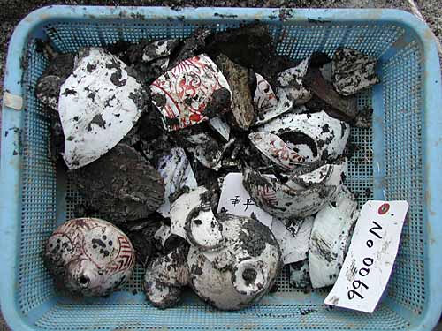 このA−3区の杭列付近を調査中に出土した製品の一部。色絵やその素地と推定される白磁がほとんどである。 *画像をクリックすると拡大画像が見れます |