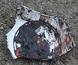 その中の一つ、内面に焼成前の赤絵具が入った状態で出土した碗。おそらく絵具入れと推定される。 |