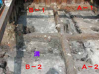 この白色砂層面では、柱穴等も多く検出されており、実際に柱等が残っているものも多い。また、A・B−1・2区(調査区の北半部)では、両側に石を組んだ溝が検出されており、おそらく建物の区画溝と推定される。溝は調査区外へと伸びているため両端の状況は分からないが、A−1区の西寄り(左寄り)を北から南方向へと伸び、A−2区の北西隅でで直角に曲がって西方向(左方向)のB−2区へと続いていた。