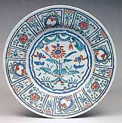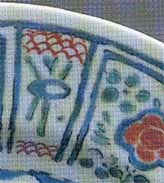 写真左は出土した芙蓉手の色絵大皿の口縁部である。焼成不良で青絵具が黒く変色しているが、文様や色構成は写真右の伝世品とまったく共通している。また、同じものは消費遺跡でも、東京大学本郷構内遺跡の391号遺構で3点まとまって出土している例が認められる。