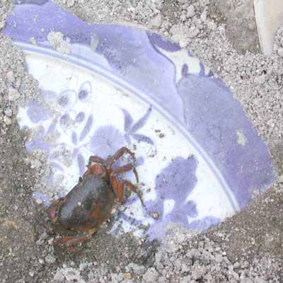 まったく調査とは何の関係もないが、地表に顔をのぞかせた磁器皿と“サワガニ”の取りあわせ。もちろん焼物じゃなくて、本物。水だけは豊富な遺跡なので、よく遊びにきている。でも、こないだはちょっと冒険し過ぎたらしく、水から離れたところでへばっていた。親切にも水の中に戻してやったら、懲りずに翌日も来ていた。あんまりうろうろすると踏まれるぞ!!