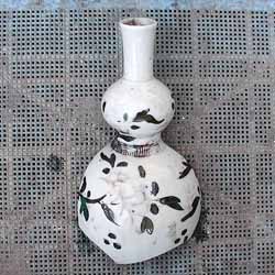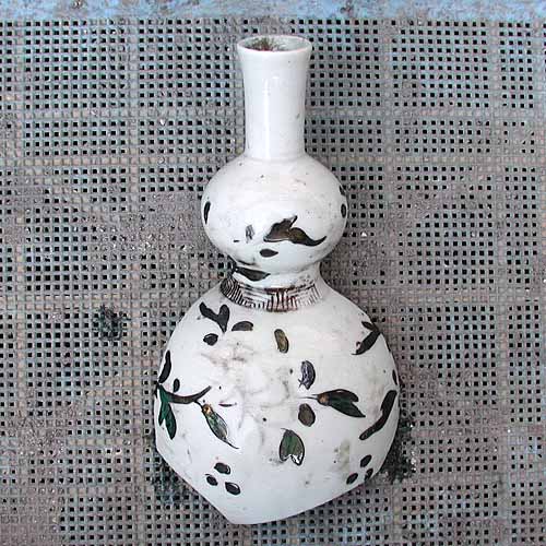 写真の色絵は、体部に牡丹文を上絵付けした瓢箪形の瓶である。共伴製品には染付の芙蓉手皿などがあり、1660年代前後の製品と推定される。