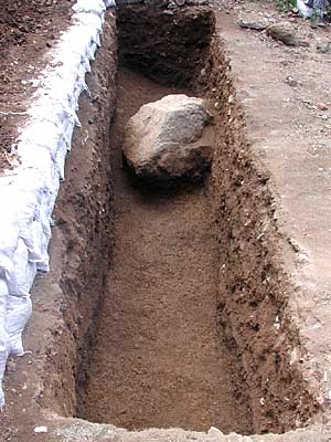 ![]() 今年掘った物原部分で出土した岩(北から) もう一つ、一連の調査を通じて、はからずしも最悪の条件(?)を目の当たりにすることとなりました。岩です。昭和40年代の調査の際にも、二番目に古いA窯の焼成室床面に、人力では動かせないほどの大きな岩が転げ落ちているのが発見され、A窯廃棄の原因ではと疑われたこともありました。ところが、そんな生易しいもんじゃなかったのです。 ここ3年間で窯体や物原の部分などで、すでに20ヶ所ほどの試掘を行っています。その物原部分の試掘溝のほとんど、それから窯体の床下なんかでも、大きな岩がそこかしこで発見されています。もちろん周囲を取り囲む岩山から崩れ落ちたものであることは、容易に想像できます。つまり、この窯場の操業期間である30年前後ほどの間に、E窯、A窯、B窯、C窯と頻繁に窯体が築き直されている背景には、こうした岩の崩落が一つの原因ではなかったかと考えられるのです。