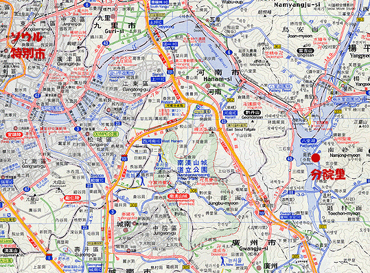 窯跡の位置する分院里は、ソウル特別市の東、京畿道広州市南終面に位置している。ソウルを南北に二分する漢江の上流沿いにあり、車でおよそ1時間半くらいの距離にある。この分院里の付近は、やや上流で北漢江と南漢江が合流し、川幅が1〜2kmほどにも達しており、八堂湖と称されちょっとした観光スポットとなっている。 |
