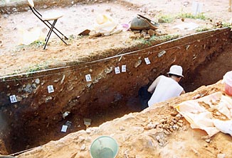 土層を一枚一枚剥いでいっているところ掘っているのは、ソウル在住の藤川幸夫さん。この方本業は別にお持ちだが、並みのプロでは及ばないくらい韓国陶磁にやたら詳しい。 |