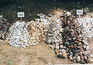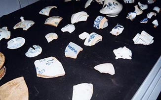 ![]() A地区調査風景(東から) 升目(グリッド)状に分割して掘る方法は日本でも一般的。状況を把握するためや見学者の便をはかるため、とりあえず、表土は広めに開けられていた。 ![]() 遺物の出土状況 遺物には製品、窯道具、窯壁片などが見られる。しかし、19世紀頃の窯なのに、日本のようにトンバイ(耐火レンガ)は見られない。 |