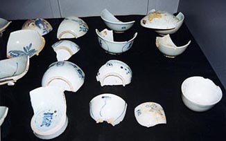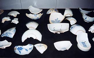 A地区の出土遺物左側の白っぽいのが製品。中央の青味を帯びたものは窯道具類、右側の黒っぽいものは窯壁片である。分院と言えども、製品の大半は白磁である。 |