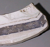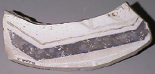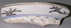 この陶片は素地などの特徴から見て、山辺田窯の製品と考えてまちがいない。製品の分類としては、色絵古九谷様式の中でも一般的に「幾何文手」と称されているものであり、主として内面に亀甲状の幾何学文様を描くこと、外面に青上絵具を用いた唐草文を巡らすことなどが特徴である。こうした幾何文手の台鉢は伝世品もいくつか知られているが、内外面の文様パターンや素地などはすべて今回の出土資料と類似している。よって、山辺田窯の中でも、おそらく同じ窯で生産された製品である可能性も高く、これまでの出土資料の中では、7号窯製品として紹介されているものと最も共通性が高い。生産年代としては、これまでの研究成果から1650年前後と推定される。 |