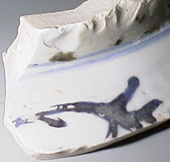 外面は胴部と底部の境に二重の染付圏線を巡らしており、胴部には上絵で唐草文が描かれている。この唐草文も一見黒色に見えるが、よく観察すると青色である。また、すでに上絵具が剥落しているが、左側の唐草の先端部には、花らしい文様も描かれている。高台は基部しか残っていないが、外面は黒絵具を用いた七宝繋ぎ文で埋められており、その上を黄色で塗りつぶしている。 |