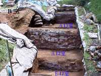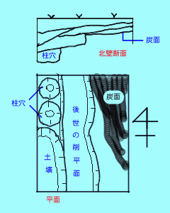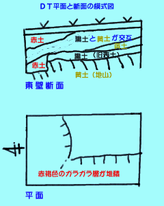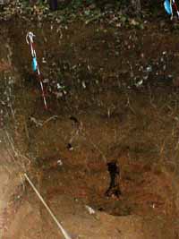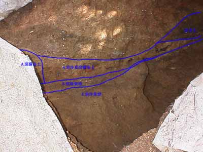 写真上の表土から深さ2m強。下半には黄色や赤色の土が何重にも堆積している。ちなみに、ピンポールにぶら下がっているのは蚊取り線香。(北から) |