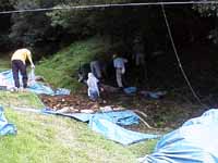 左側のシートの部分が窯体。写真右下から左上に向かって登っている。右側のこんもり盛り上がった部分が物原である。