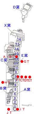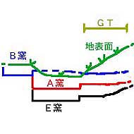 調査前までの認識では、誰でも登りの右側(南側)は本来谷になっていたが、谷が浅かったので次第に小山状の物原が形成されたと信じていた。少なくとも、これ以外の考え方は聞いたことがない。ところが、まったく谷がない。窯体の外側から平らの作業段が2mほども南側に続き、その先は地形が上がりはじめる。通常の窯では、逆に作業段の先が谷になっており、失敗品が廃棄され物原層が形成されている。これは、CT〜ET、GTと2個所で確認しているため、ほぼ全体がそうなっていると考えて間違いなかろう。