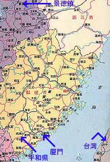 陂溝窯は、中国南部、福建省の平和県に位置する。平和県は、台湾海峡に面した厦門市から西南に直線距離で100km程度、車で3時間ほどの山間にある。面積は2,328.6kFで、東京都よりもやや広いが、人口は53万人に過ぎない。この福建省の窯場は、近年では一般的にしょう州窯と称されることが多いが(“しょう”はサンズイに「章」と書くが、日本の漢字にはないので平仮名で記す)、まだその範囲は明確には規定されていないらしい。 陂溝窯は、この平和県の市街地から南に約26km、車で1時間ほどの五寨郷寨河村洞口にある。オフロード車ならば、窯跡のすぐ近くまで行くことができるが、通常の車だと五寨村で下車、さらに山道を30分ほど歩く必要がある。 |