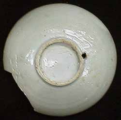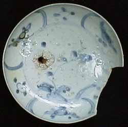 前回ご紹介した染付松文碗と同じA窯の物原から出土した染付小皿である。口径13.0cm、底径4.9cmで、底径/口径の比は0.38と高台幅はかなり小さめである。表面にはやや灰色がかった釉が掛けられており、内面は淡い色調の呉須で施文されている。文様は、二重の染付圏線で内外に区切り、内側には岩から生えた草と小さな丸い月(?)を描く。外側は三つの窓を設けて内部に花文を描き、その外部には簡略化された宝文を配している。窓内の花は、茎の部分に丸みのある葉を2枚程度配し、楕円形の花弁の両側から各3枚の葉が飛び出したような描き方がされている。こうした描き方は、窓内に描くことも含めて、1630年代後半〜40年代に流行しており、多くの窯に類例がある。 |
