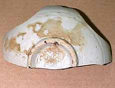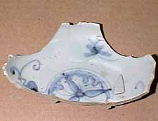 見込み中央部に銀杏の三方割文は、1630年代後半〜40年代の定番の構図である。昨夏の天狗谷窯跡の発掘調査で出土した皿で、高台径の小さな典型的な初期伊万里スタイルの製品である。 見込みの周囲には、四方に蝶文と唐草かと思われる文様を交互に配し、口縁部には一重の圏線を迴らす。こうした銀杏の三方割文の皿は、一般的にはもう少し浅めの皿に大きく銀杏を描き、周囲には窓などを配しているものが多い。 口径13cm前後、底径4.8cm程度、器高3.3cmほどと、高台径はかなり狭い。通常、高台径は時期とともに徐々に大きくなると思われているが、実は同じ初期伊万里タイプの皿でも、概してこの時期が最も狭い。また、表面掛けられた釉薬も、むしろこれより前の時期に白いものが多く、この時期が最も青味を帯びたものが多い傾向がある。