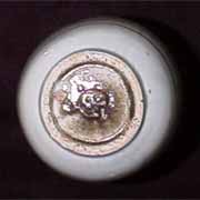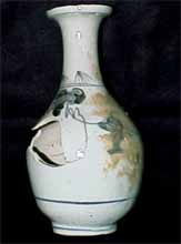 昨夏の発掘調査で出土した染付瓶である。出土地点は二次堆積層であるため、それ自体から年代の把握はできない。ただし、昭和40年代の発掘調査の際にも最も新しいC窯の物原から類品が出土しており、相対的には新しい時期の製品であることが分かる。 |