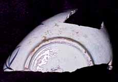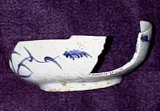 以前紹介した「染付草文平碗」と同様な文様を描いた小鉢である。やはりB窯の物原から出土しており、1650年代の製品と推定される。 外面胴部にはおそらく2方向に草文を描き、同種の穂先を内面口縁部近くにも1ヶ所配している。 成形は最初ロクロで丸く作り、口縁部をカットして段を付け、方形に近い形状に曲げている。口径は不明であるが、おそらく長辺が13cm程度、短辺が10cm程度、高台径も推定7cm前後、器高は4.5〜5.0cmほどである。 これまでほとんど類例のない製品である。