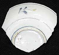 実はこうした製品は、厳密にいえば、従来の「初期伊万里」、「古九谷」という様式分類の範疇には適当な収め場所がない。器厚は底部で0.6cmほどと比較的厚めで、質的には一見初期伊万里に近い。しかし、文様の配し方や畳付の処理などは、どちらかといえば古九谷様式に近く、両者の中間的な要素を有している。