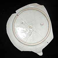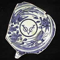 1992年に行った泉山口屋番所遺跡の調査で出土した芙蓉手皿である。土壙の中に多量の製品が一括して廃棄されており、これと同様な皿も数個体含まれていた。この製品のようにハリ支え時のハリがそのまま残るものや、変形したものが多いことなどから、製品として使用されたものとは考えられない。おそらく、建物構築の際の整地用に、焼成不良の製品が廃棄されたものと推定される。