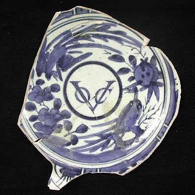 この皿は、見込み中央部には「VOC」銘を配し、周囲には柘榴と牡丹描き、その間に鳳凰を二羽配している。外面は無文で、高台内には4ヶ所ハリを配し、その中の3つのハリが付着したままである。口径は不明であるが、底径は15.0cmほどである。