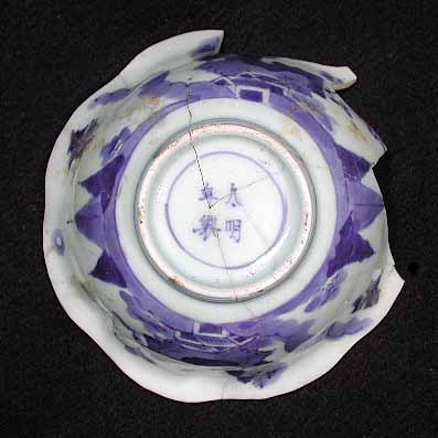 口径は約11.4cm、底径4.6cm、器高5.2〜5.5cmほど。捻花状に型打ち成形し、外面には、2方向に同意匠の網干山水文を描いている。高台内には、一重の圏線の中に「太明年製」銘を2行に配し、見込みには二重圏線内に手描きの五弁花文を描いている。