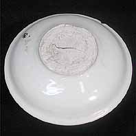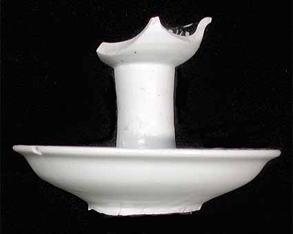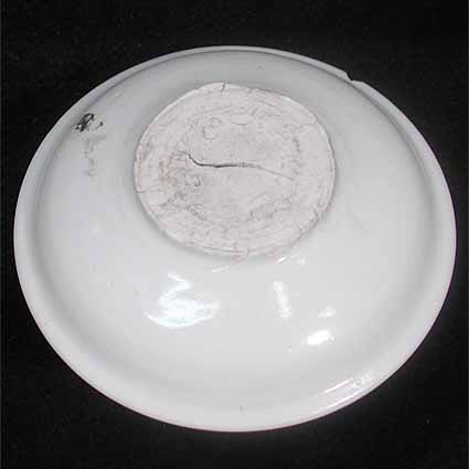 直径11.5cmほどの皿状の器の中央部に高さ約7.0cmの高坏状の器が貼り付けられており、その内面中央部には、直径0.5cmほどの穴が開けられている。外面は底部が無釉で糸切痕が残っており、よく見ると、周囲は円形に剥離痕が残っている。こうした点から、この底部には本来さらに台脚が付いていたものと想像される。