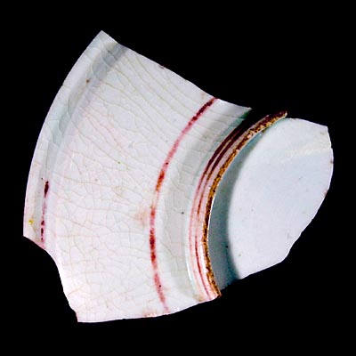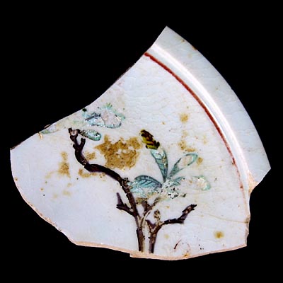今年、防災工事の際に、中白川窯跡物原付近から同窯の染付製品などとともに出土した色絵中皿である。二次堆積層中からの出土であるため共伴関係等は不明であるが、操業期間中の製品と推定されるされるため、同窯で焼成された素地に絵付けされた製品である可能性は高い。