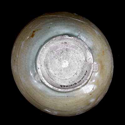 この碗は、そうした最下に近い土層から出土している製品の一つで、出土層の下限は、おそらく1660年代初頭前後頃と推定される。やや酸化気味に焼上っているため、黄褐色に近い色調となっているが、高台付近に本来の色調が現れているように、外面には青磁釉が掛けられている。高台脇までは施釉されているが高台部は無釉で、高台外側面は不規則に釉が垂れている。内面は、口縁部まで青磁釉が掛けられているが、胴部以下は白色の透明釉が掛けられている。