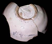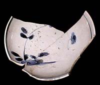 草花の周りを翔ぶ一匹の蝶。文様としてはありふれた題材だ。口径13.0cm、底径5.4cm、いわゆる典型的な「初期伊万里」である。やや焼きが甘く内面はやや赤身を帯びており、畳付には砂が付着している。外面胴部には呉須で「慶安元年□月朔日」の銘があり、1648年に作られたことが分かる。有田内山への東の出入りを監視した泉山口屋番所遺跡から出土したものだが、当時ここに番所はまだ築かれておらず、付近に磁器の工房があったらしい。ともに出土している製品の中には、古九谷様式の色絵陶片も30点ほど含まれている。なお、近接する楠木谷窯跡で、類似した製品が出土している。 |