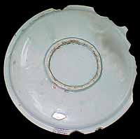これから何回かに分けて、新たに51番目の窯場として登録した岩中窯跡の出土品をご紹介してみたいと思う。今回はその第一段、「染付銀杏三方割亀甲文皿」である。 縁を小さく折った、口径21.3cm、底径8.6cmの立ち上がりの浅い中皿である。物原最下の遺物集中層から出土している。焼成の際に胴部が少し垂れて、中央部がやや盛り上がったように変形している。高台には砂が付着し、高台脇には指跡が残る。文様としては、さほど珍しいというものでもないが、同じ形状で同文を配した中皿は、即座には類例が思い浮かばない。5寸以下の皿の場合は、同じ文様の製品が多くの窯場で焼かれていることが多い。しかし、7寸以上の皿の場合、一見同様に見えても、窯場の個性が強く反映されることが多い。