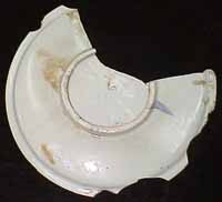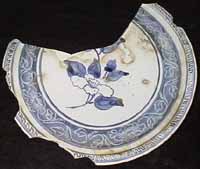 椿の折枝一輪。簡素ではあるが、何とも風情を感じる文様である。濃みを入れない白い花が、いっそう目をくぎ付けにする。その周囲に濃みを巡らし唐草文を釘彫り、口縁部には櫛目文を配す。全体的な構図としても、かなり巧みだ。 口径21cm程度、底径は9cmをやや超える程度だ。やはり、物原最下の遺物集中層から出土しているが、ほかの窯での類例は知らない。外面には、おそらく偶然と思われる呉須の付着があるが、この程度は問題にもならないところに、現代のような画一的な工業製品にはない新鮮味がある。