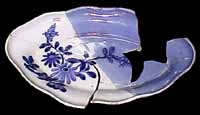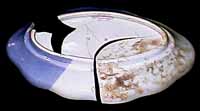 たまにはおもむきを変えて、18世紀の製品も紹介してみよう。この皿は、平成2年度に発掘調査した上南山地区のムクロ谷窯跡で出土したものである。半分に薄瑠璃釉、残りに透明釉を掛けた片身替りにしており、見込みには染付で菊文が描かれる。焼成室の床面から複数まとまって出土しており、最終焼成品であることが分かる。上絵を加えたほぼ同じ伝世品があり、元文三年(1738)銘の箱書きを伴う(九州陶磁文化館蔵)。伝世品には外面胴部に宝文が二方向に配されるが、この出土品は無文である。しかし、それ以外はすべて共通している。 |