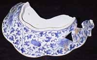 前回ご紹介した薄瑠璃掛分け菊花文皿と同様に、ムクロ谷窯跡の焼成室床面からまとまって出土している製品である。内外に異なった釉を掛分けており、内面は青磁、外面は染付である。形状は茄子の葉を模しており、見込みに茄子の身と花が型を用いて陽刻されている。高台は皿の形状に合せて変形にしており、胴部には精緻な牡丹唐草文が描かれている。なお、同型と推定される皿には、享保十六年(1731)銘の共箱入で伝世しているものがある(九州陶磁文化館蔵)。ただし、伝世品は内外面ともに青磁で高台は、円形である。また、出土品は葉の茎の形状に沿って小孔が穿たれているが、伝世品の方は潰れている。 |