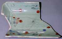 佐賀藩は1650年代後半頃に、上絵付け工程を分業化した。業者は有田内山地区の中央部、本幸平地区の一角に集められ、後に業者の多かった部分を分割して赤絵町が成立したと云う。当初11軒に制限された赤絵屋の中で、9軒が赤絵町にあったと伝えられる。昭和63年にその一軒の発掘調査を行った。コンテナ2,000箱近くにも及ぶ出土品の中には、当然のことながら色絵製品も多い。 |