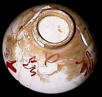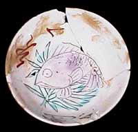 赤絵町遺跡から出土した、見込みに上絵具で鯛文を描いた小形の碗である。一般的に「めでた盃」と呼ばれ、かつては九谷の春日山窯の製品と考えられていた。しかし、赤絵町遺跡で、数十個まとめて出土しており、上絵付け前の素地ならば数百個体程度もある。この碗は、見込みの釉を円形に剥いで、同形の碗を直接10個前後も重ねて焼成している。そのため、釉を剥いだ部分を見えなくするため、その上に上絵で鯛文を描いているのである。つまり、比較的量産を目的とした製品である。おそらく下絵は描かずに直接施文しているため、個々の碗によって、かなり文様の大きさや形状が異なっている。 |
