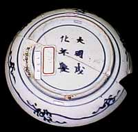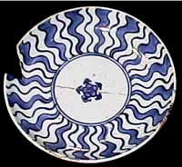 やはり1680年代〜90年代頃と推定される遺構から出土した、赤絵町遺跡の染付小皿である。赤絵町遺跡の出土遺物として、染付製品を掲げるのも奇異な感じを受けるかもしれないが、意外にも出土遺物には染付製品が多い。家屋造成の際に水はけを良くするために床下に敷いた整地用や生活用具として使用されたものが多いものと推定されるが、ここに染付製品も集まってくる何らかの体制があった可能性もある。1650年代〜1820年代頃までの土層が順に堆積していたため、製品の変遷が比較的容易に追える遺跡である。 |
