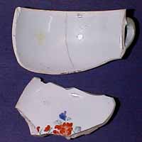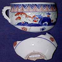 染付を配した素地に色絵を付けた蓋物である。同じ伝世品から、二方向に把手を付け、高い脚が付けられていたことが分かる。また、出土していないが、蓋の摘みは獅子形になっている。一見して海外向けの製品であることが分かるが、17世紀末から流行する金襴手の染錦ではない。外面には岩を染付にして、赤、緑、青絵具で山水文が描かれている。ちなみに赤絵町遺跡からは、同様な山水文を見込みに配した柿右衛門様式風な中皿が出土している。見込みの牡丹文も明るい朱色の赤、やや青味を帯びた緑、青を用いて描かれているが、この組合せも柿右衛門様式に通有なものである。文様個々は柿右衛門様式に近いが、金襴手スタイルの誕生を予感させるものである。 |