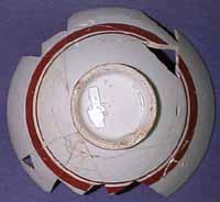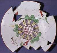 先日ご紹介した色絵花散らし文嗽碗と同質のやや雑な質の製品である。ただし、こちらは染付は一切用いておらず、白磁に上絵を付けたものである。外面は赤絵具だけを用い、高台脇に圏線、胴部には圏線と帯を迴らしている。この赤の帯も輪郭を描いて内部を塗り潰したものではなく、筋車に載せ一気に描いたものである。内面は見込みに赤・黄・紫を用いて花文を描き、蛇ノ目釉剥ぎした部分を隠している。その周囲には、三方に緑で葉を描き、胴部に花や蝶文を描いている。ここで用いられている緑は黄緑系のもので、1690年代に新たに使われるようになり、以後金襴手スタイルの製品ではごく一般的に使用されるようになる。赤も輪郭線用が塗り潰し用よりも濃いのが一般的であるが、この製品の場合、塗り用にも濃い赤紫の絵具を使用している。こうした用法も、金襴手スタイルの製品には多々見られる。また、使われる絵具の組合せや対称的に文様を配置する構図も同様である。しかし、白磁素地を用いて口銹を施し、余白を十分にとる方法は、柿右衛門様式に通有なものであり、両スタイルの接点となる時期の様相を表している。 |
