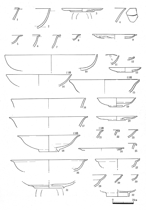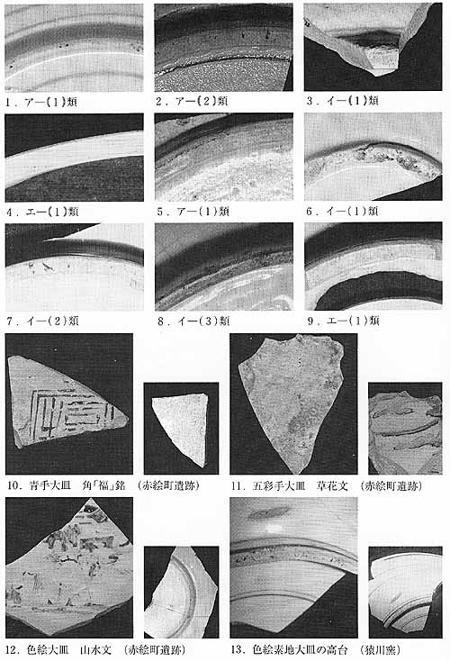 3. 出土素地の分類 (六)丸尾窯 本窯から出土している色絵素地の可能性がある製品は約270点ほどあり、その中には染付の入るものが50数点ある。ただし出土製品は小片が多いため、中には染付製品の混じっている可能性はある。素地はほぼ皿類に限られ全体の形状が分かるものは少ないが、部分的にはかなり多様な種類がある。 =染付の入るもの= (1)体部からの分類 《A》口縁部の直行するもの Fig.6へ A−(1)類(Fig.6−1) A−(2)類(Fig.6−2) A−(3)類(Fig.6−3) 《B》口縁部の外反するもの Fig.6へ B−(1)類(Fig.6−4) 《C》折り縁にするもの Fig.6へ C−(1)類(Fig.6−5) 縁を急角度で折った深めの皿で、内外面の縁の内側に圏線を1本づつ入れたもの。縁の幅は1.2cm程度である。 C−(2)類(Fig.6−6) C−(3)類(Fig.6−7) C−(4)類(Fig.6−8) C−(5)類(Fig.6−9) 《他》その他 PL.5へ 他−(1)類(PL.5−2) 他−(2)類(PL.5−3) (2)底部からの分類 《ア》高台の断面をU字形にするもの PL.9へ ア−(1)類(PL.9−1) ア−(2)類(PL.9−2) 《イ》高台の断面を四角くするもの PL.9へ イ−(1)類(PL.9−3) 《エ》高台の高いもの PL.9へ エ−(1)類(PL.9−4) =染付の入らないもの= (1)体部からの分類 《A》口縁部の直行するもの Fig.6へ A−(1)類(Fig.6−10) A−(2)類(Fig.6−14) A−(3)類(Fig.6−11) A−(4)類(Fig.6−13) A−(5)類(Fig.6−12) 《B》口縁部の外反するもの Fig.6へ B−(1)類(Fig.6−16) B−(2)類(Fig.6−17) B−(3)類(Fig.6−18) B−(4)類(Fig.6−15) B−(5)類(Fig.6−19) B−(6)類(Fig.6−20) 《C》折り縁にするもの Fig.6へ C−(1)類(Fig.6−26) C−(2)類(Fig.6−21) C−(3)類(Fig.6−22) C−(4)類(Fig.6−23) C−(5)類(Fig.6−24) C−(6)類(Fig.6−25) 《D》体部を2段以上にするもの Fig.6へ D−(1)類(Fig.6−27・28) D−(2)類(Fig.6−29) 《E》ドラ鉢形 Fig.6へ E−(1)類(Fig.6−30) 《他》その他 PL.5へ 他−(1)類(PL.5−5) (2)底部からの分類 《ア》高台の断面をU字形にするもの PL.9へ ア−(1)類(PL.9−5) 《イ》高台の断面を四角くするもの PL.9へ イ−(1)類(PL.9−6) イ−(2)類(PL.9−7) イ−(3)類(PL.9−8) 《エ》高台の高いもの PL.9へ エ−(1)類(PL.9−9)