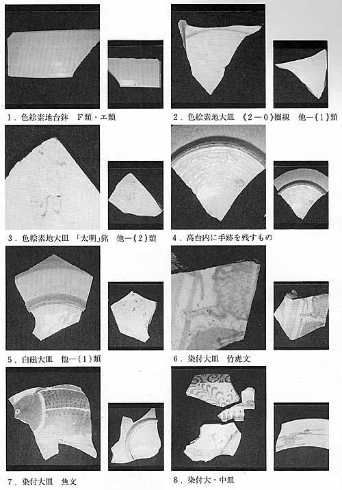 本文中では、染付入り素地を体部の形状から《A》〜《C》・《他》の4種類、計11タイプに細分し、底部の形状から《ア》・《イ》・《エ》の3種類、計4タイプに細分した。また白磁素地は、体部の形状から《A》〜《E》・《他》の6種類、計21タイプに細分し、底部の形状から《ア》・《イ》・《エ》の3種類、計5タイプに細分した。