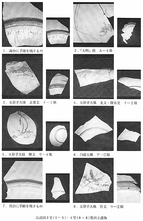 窯跡では素地だけでなく、上絵を付けた製品もいくらか出土している。大皿類は山辺田3号窯、4号窯、2号窯、丸尾窯などにあり、窯跡以外では赤絵町遺跡(註7)でも出土している。個体数でも10数点に上り、その全てがいわゆる古九谷様式と呼ばれているものである。