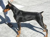 『犬』と言うとこの形を思い浮かべる人が多いと言われているドーベルマンは、 実に理想的なプロポーションの持ち主です。 左隣のモデルをご覧下さい。 ドーベルマンの体格はほぼ正方形の枠に収まるようになっている事が お分かりいただけると思います。 特に男の子はより正方形に近い体格をしています。 体重は大体35kg〜45kgくらいです。 『ドーベルマン』と言うと、怖い犬種だと思われがちですが、 基本的な性格は極めて柔順で穏やかで子供好きなのです。 ただ、元々番犬として作られた犬種ですので、 家族以外の人に対してちょっと注意深いところがありますが、 むやみやたらと人を威嚇することはありません(余程の事をしない限り)。 |